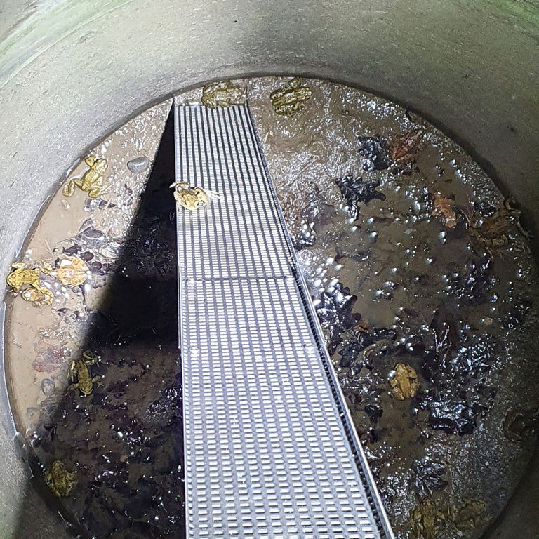 To help the animals, exit aids can be installed to enable them to climb out. These are available in different versions, the most common of which consist of a plastic mesh (Terramat) or a ramp made of perforated sheet metal. These "frog ladders" are simple, easy to install and yet effective. After building these ladders, the number of amphibians found dead in them fell by 96 percent.
